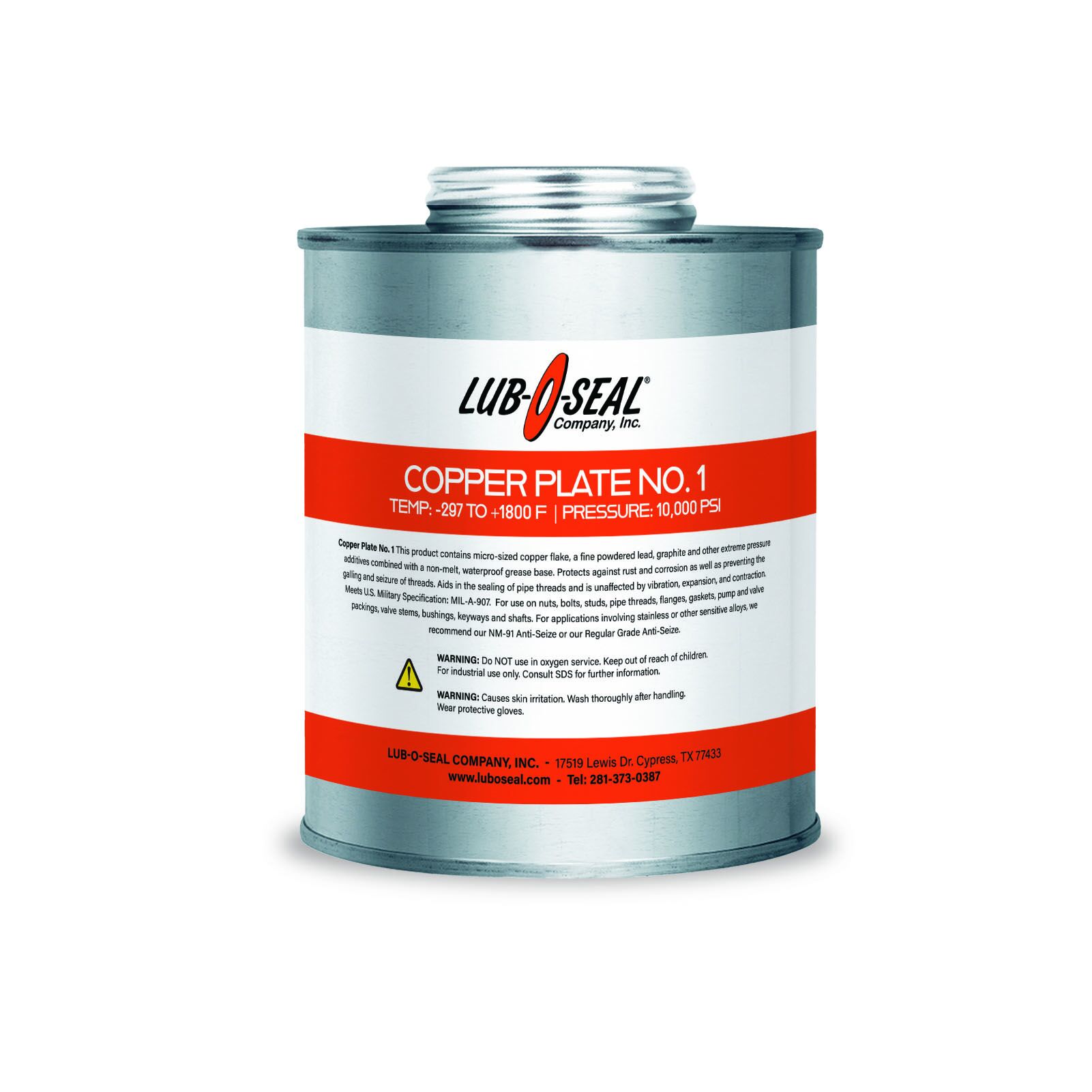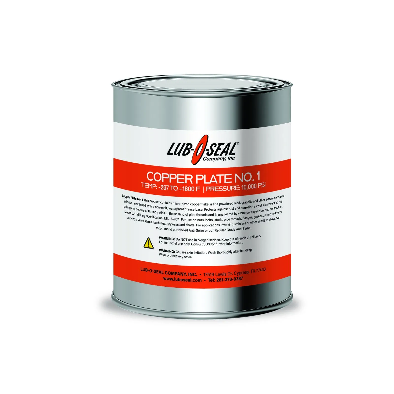 Copper Plate #1 Seize – contains micro-sized copper flake, a fine powdered lead, graphite, and other extreme pressure additives combined with a non-melt, waterproof grease base. Protects against rust and corrosion as well as prevents the galling and seizure of threads. Aids in the sealing of pipe threads and is unaffected by vibration, expansion, and contraction. Meets U.S. Military Specification: MIL-A-907.