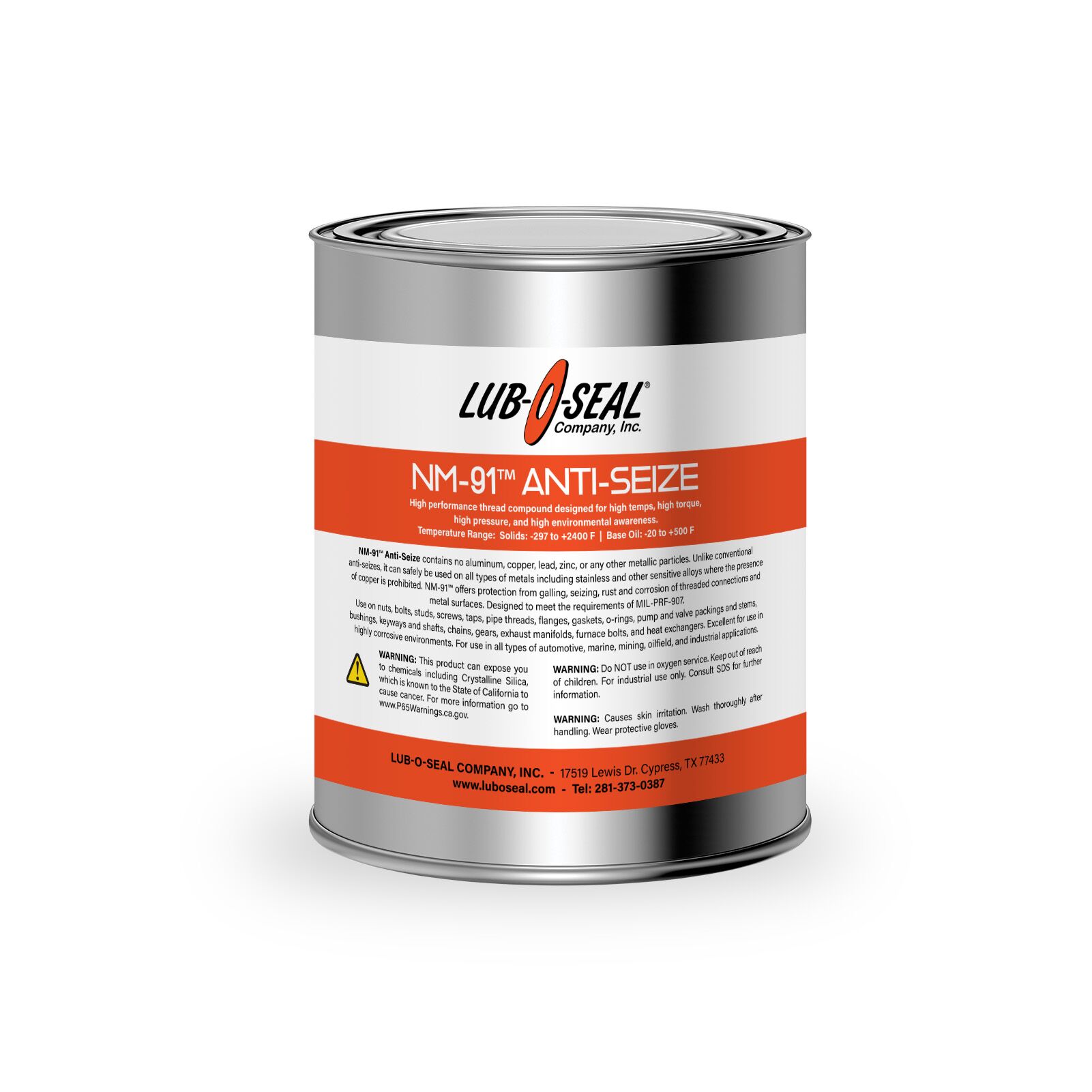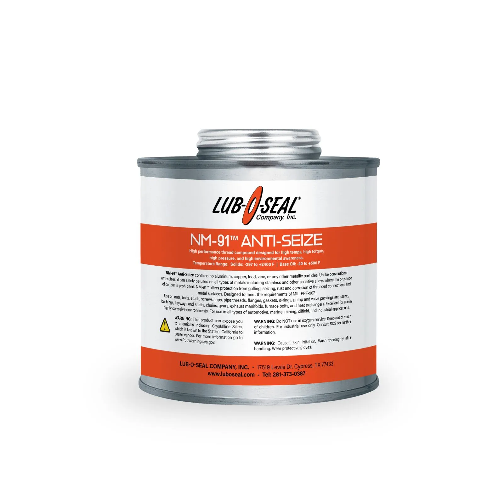 NM-91™ Anti-Seize contains no aluminum, copper, lead, zinc, or any other metallic particles. Unlike conventional anti-seizes, it can safely be used on all types of metals including stainless and other sensitive alloys where the presence of copper is prohibited. NM-91™ offers protection from galling, seizing, rust, and corrosion of threaded connections and metal surfaces. Designed to meet the requirements of MIL-PRF-907.