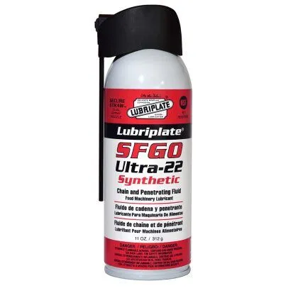 LUBRIPLATE SFGO Ultra-22 Synthetic Chain & Penetrating Fluid Spray is designed to lubricate all types of chain operating in extreme cold temperature environments, dusty environments. It delivers excellent performance as a penetrating fluid. This PAO, full synthetic hydrocarbon fluid, is NSF H1 Registered Food Grade. It and has an operating temperature range of -50F to 250F. LUBRIPLATE SFGO Ultra-22 Synthetic Chain & Penetrating Fluid Spray provides the penetrating, cleaning, flushing, and long-lasting lubricating film required to achieve increased life from all types of roller chain operating in adverse environments.